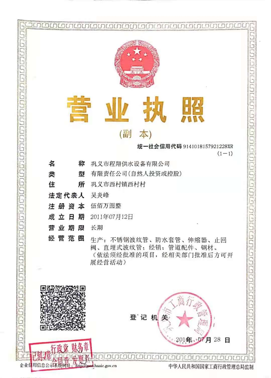 鞏義市程翔供水設備有限公司是一家集研發,生產,銷售,服務為一體的高新技術企業!鞏義市程翔供水設備有限公司有20多年的生產經驗。主要生產:套筒補償器,旋轉補償器,球形補償器,波紋補償器,鋼制伸縮器,傳力接頭,金屬軟管,溝槽軟管,大拉桿補償器,直埋補償器,橡膠軟連接等各種管道配件。生產的產品受到各個單位的一致好評。 標準...